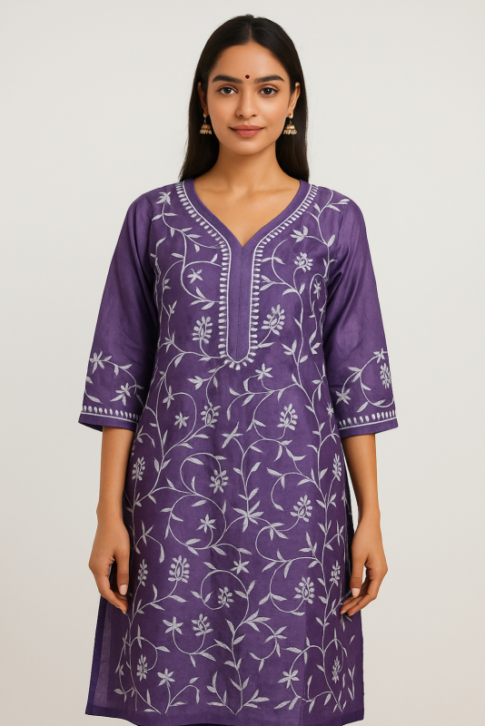White Cotton Chikankari Kurta – Round Neck, Hand Embroidery (S-XL)